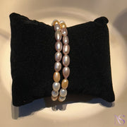 Lyra is a chic design with oval-shaped freshwater pearls in soft hues of purple, peach, and white. This bracelet is crafted to add a pop of color and elegance to any outfit, bringing a unique touch to your look.