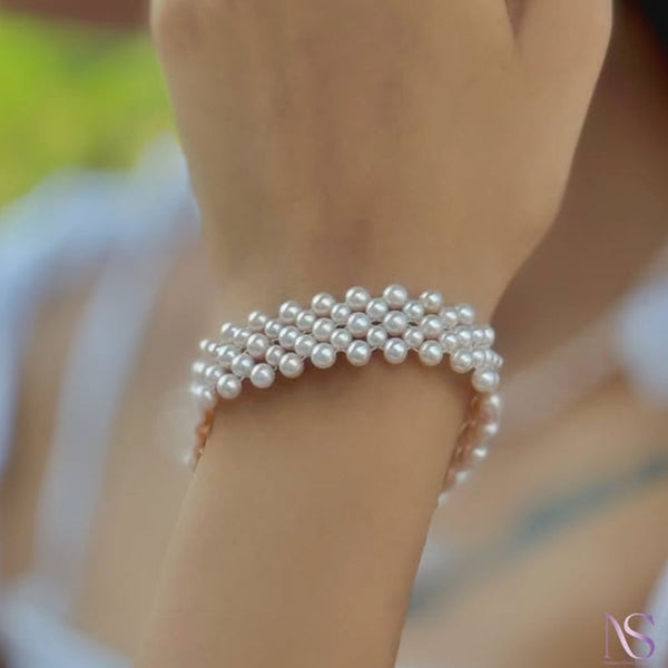 Made with round, baby pink freshwater pearls, the Nila bracelet wraps gently around your wrist. Its mesh-like design can add depth and texture, to your entire look.