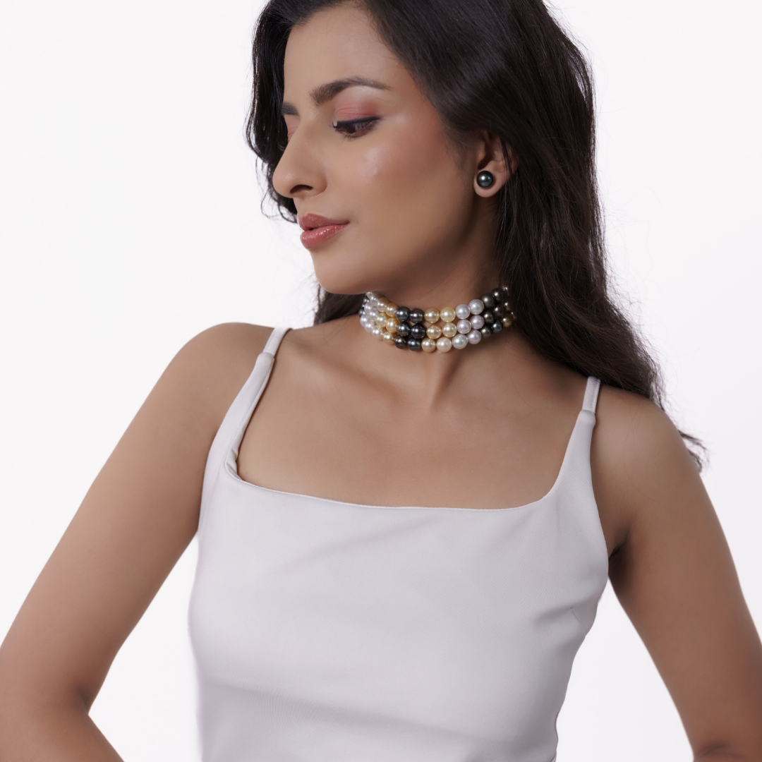 The Dahlia Choker is a stunning piece that captures the varied beauty of the sea. This unique design features a captivating trio of South Sea pearls in a beautiful mix of golden, white, and black hues. A symbol of timeless sophistication, this choker is designed for a perfect, comfortable fit that sits elegantly on your collarbone.