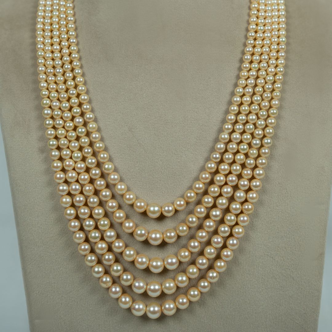 Reflecting the pure and refined nature of the pearls, the Elise necklace is a modern masterpiece. This exquisite piece features 5 layers of luminous Akoya pearls, each a sphere of flawless perfection. The pearls showcase a magnificent, buttery champagne color that glows with a subtle, inner light. Designed for graceful movement, the strands cascade beautifully and adds a touch of sophisticated warmth and luxury to any look.