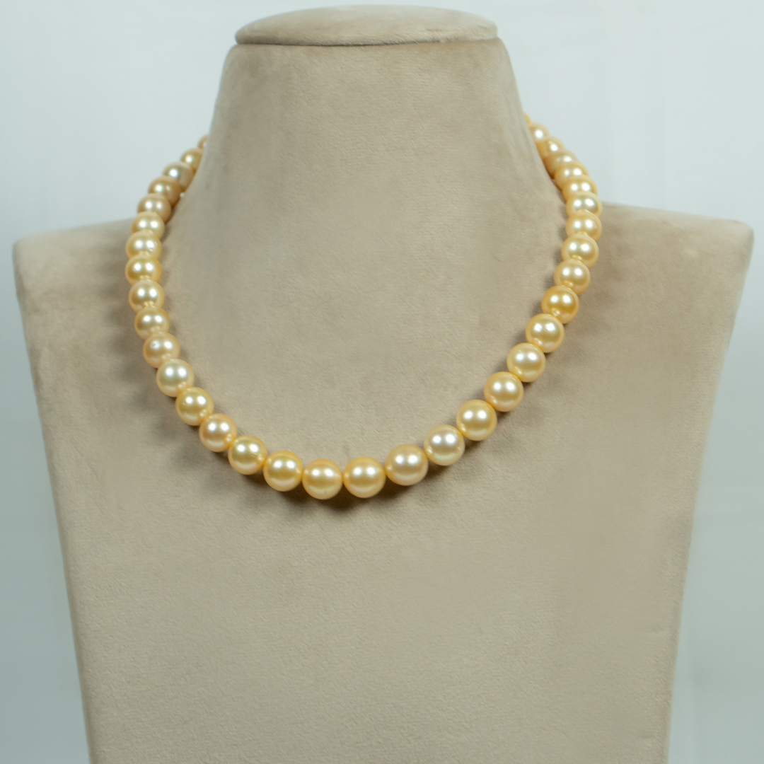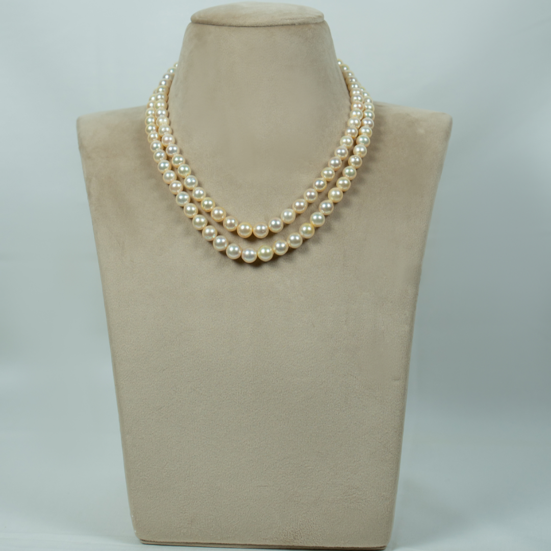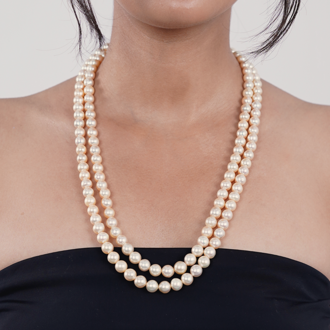 A captured moment of golden light, this necklace is an embodiment of subtle, quiet luxury. This exceptional strand of AA quality Akoya pearls showcases a luminous, honeyed champagne color that radiates a warm inner glow. Each pearl, a flawlessly sculpted sphere, has been meticulously chosen to create a stunning, continuous flow. At a timeless 23 to 24-inch matinee length, the necklace drapes beautifully, making it an effortlessly elegant piece that adds a touch of grace to every movement.