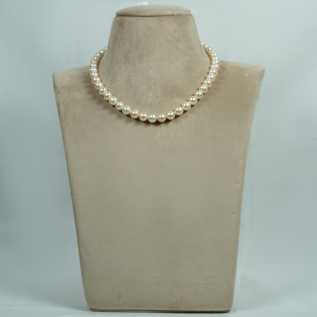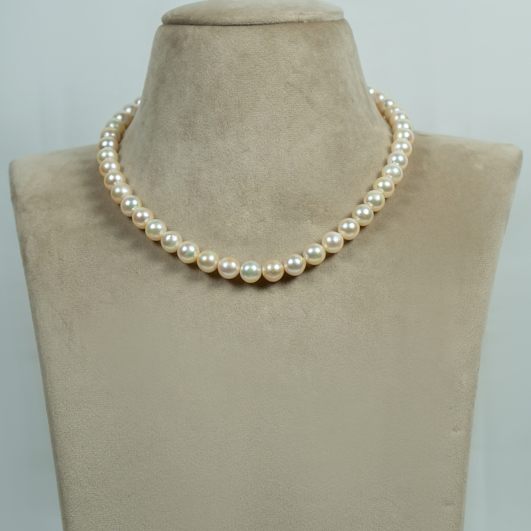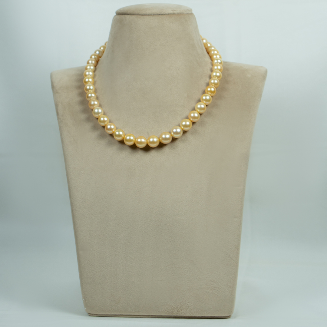 A captured moment of golden light, this necklace is an embodiment of subtle, quiet luxury. This exceptional strand of AA quality Akoya pearls showcases a luminous, honeyed champagne color that radiates a warm inner glow. Each pearl, a flawlessly sculpted sphere, has been meticulously chosen to create a stunning, continuous flow. At a timeless 23 to 24-inch matinee length, the necklace drapes beautifully, making it an effortlessly elegant piece that adds a touch of grace to every movement.
