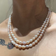 Eira combines two layers of white oval graduated freshwater pearls, giving you a clean, balanced look. It’s the perfect piece for those who like simple, elegant designs.